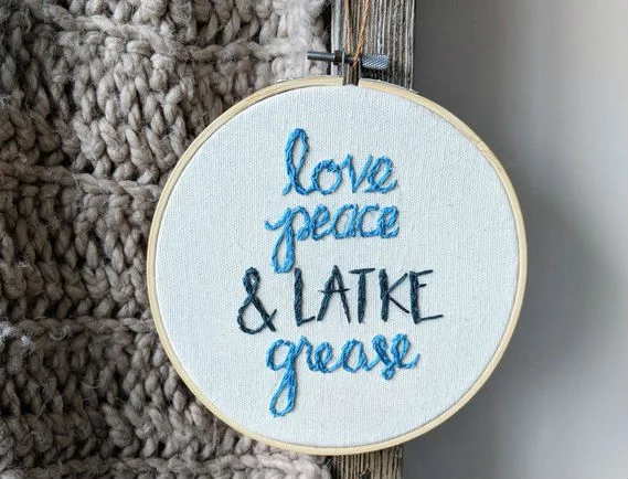 The yarn-on-canvas decoration is made to order from the Boston-based company. But, Ecker warns, “We recommend keeping it out of the kitchen during latke making to avoid smelling like oil.”